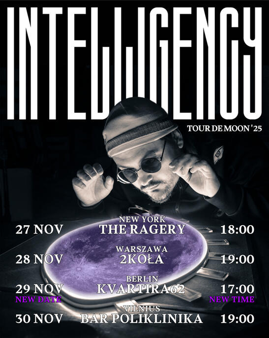 INTELLIGENCY, авторы мирового суперхита "August" — возвращаются c лучшими хитами и новыми песнями. В рамках Tour de Moon группа впервые выступит в Берлине и Нью-Йорке, а также даст два больших концерта в полном составе в Варшаве и Вильнюсе. Не пропустите легенд минского техноблюза!